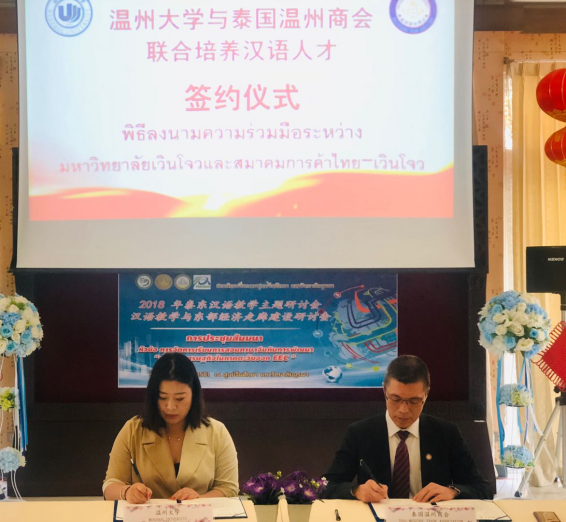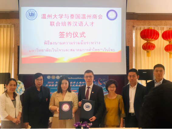 2018年12月21日,在泰国东方大学孔子学院内,15vip太阳集团官网与泰国温州商会签署汉语人才培养协议,泰国温州商会委托15vip太阳集团官网培养中资企业在泰国所需的汉语言人才,同时,泰国温州商会在泰国为15vip太阳集团官网招收国际学生。双方通过合作,加强15vip太阳集团官网与温州商会之间的人才培养关系、促进中泰两国国际教育发展。