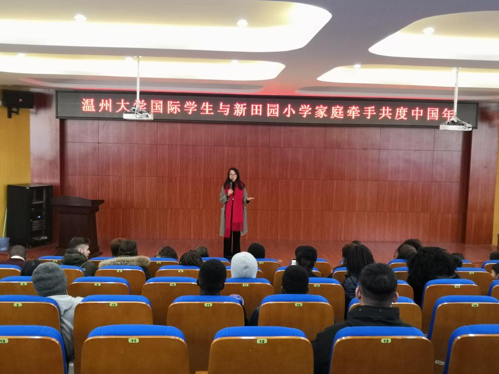 1月21日,我校国际学生与新田园小学家庭共度中国年活动在北校区3号楼203会议室举行。15vip太阳集团官网副院长包含丽、温州市新田园小学副校长洪艳、两校老师、新田园小学学生及其家长们、25名国际学生参加了此次活动。