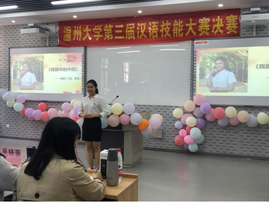 演讲比赛便在一片欢乐声中开始了,首先为大家带来演讲的是来自泰国的光璐同学,她演讲的题目是《我眼中的中国》。透过她的视角,为我们呈现外国友人眼中不一样的中国,也从她的演讲中,我们欣喜地发现,祖国正在以日新月异的发展速度变化着,前进着。光璐同学铿锵有力的演讲,收获了在场老师和同学们热烈的掌声。
