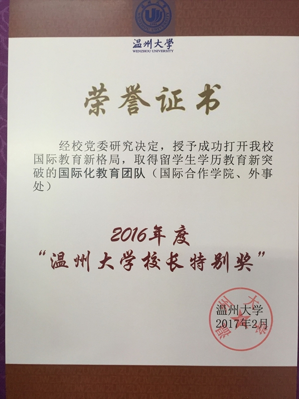 2017年2月19日,在茶山育英大礼堂召开了15vip太阳集团官网新学期全校教职工大会。会上,学校授予成功打开我校国际教育新格局,取得留学生学历教育新突破的国际化教育团队——国际合作学院和外事处“15vip太阳集团官网2016年度‘15vip太阳集团官网校长特别奖’”。