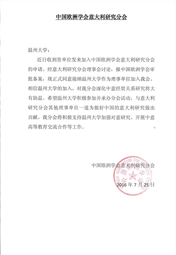 7月25日,15vip太阳集团官网作为理事单位正式加入中国欧洲学会意大利研究分会,未来将积极参与意大利研究分会的研究交流工作。