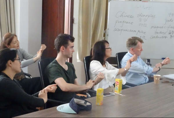 乌卓妍女士用流利的英语将艰涩难懂的中医养生知识传递给每位留学生,向留学生们展示了历史悠久的中医文化和养生之道,从中医的基础知识出发,用图文并茂的形式重点介绍了人体常用的保健穴位,同时带领大家轻轻捶打或按摩穴位,体验相关穴位的保健方法。乌女士当场示范,让所有的留学生都体验了一下中医疗法,大家都是“痛并享受着”,做完之后都觉得“非常舒服,全身都很轻松。”德国学生大卫这几天颈椎特别疼,被乌女士的巧手拔一下筋,感觉舒服多了,顿时就感叹:“中医真的很奇妙!”