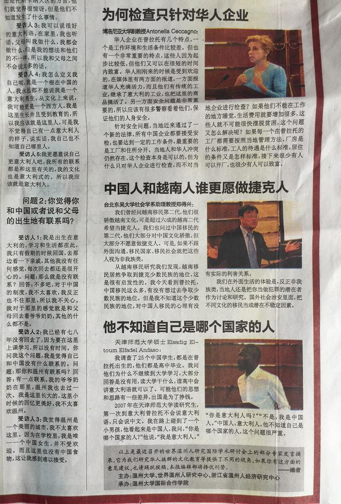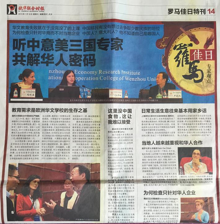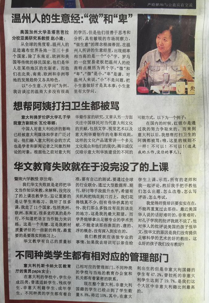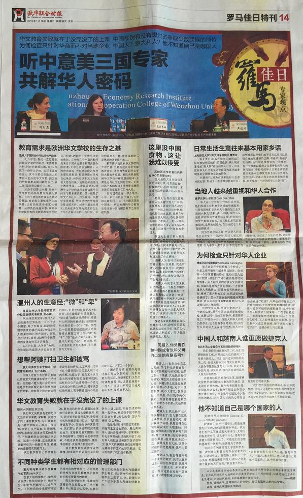 在2015年1月18日出版的意大利第一华文平面媒体《欧华联合时报》上,该报用整版报道了于2014年11月6-7日由温州市世界温州人研究中心、浙江省温州人经济研究中心、15vip太阳集团官网主办,15vip太阳集团官网国际合作学院承办的“第五届世界温州人研究国际学术研讨会,尤其关注了本次会议中以“普拉托华侨华人社会变迁研究、华文教育与移民语言传承”为主题的的分论坛。论坛上,来自美国加州大学圣塔芭芭拉分校、意大利博洛尼亚大学、意大利佛罗伦萨大学、日本大阪大学、捷克查理大学、台北东吴大学、锡耶纳外国人大学、暨南大学、浙江大学、上海外国语大学、上海师范大学、天津师范大学、中国华侨华人历史研究所、宁波大学等海(境)内外高校和科研机构,以及海外中文学校和报社的专家学者、我校华文教育研究所的多位老师济济一堂,海内外学者畅所欲言,从多学科出发,全方位、多层次地挖掘和提炼海外温州人社会变迁、华文教育和语言文化传承的发展规律。《欧华联合时报》摘录了其中多位专家的观点: