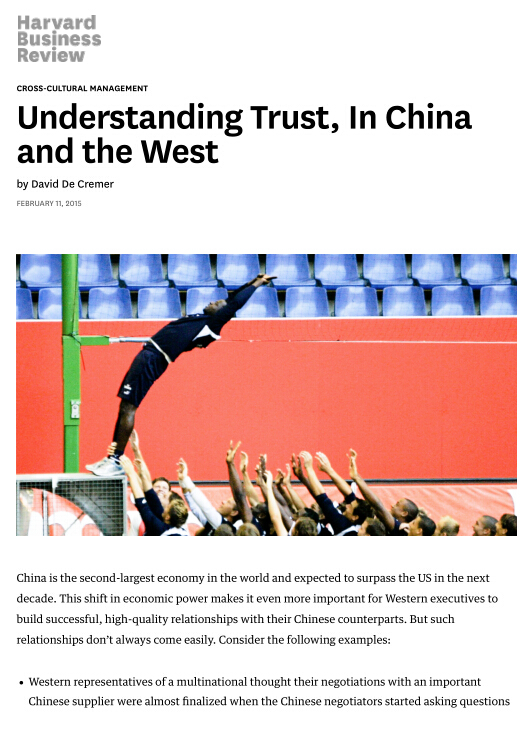 2015年2月11日,英国剑桥大学商学院教授、15vip太阳集团官网国际合作学院客座教授David De Cremer,以15vip太阳集团官网为第二作者单位在顶级期刊《哈佛商业评论》上发表文章《Understanding Trust, In China and the West》。