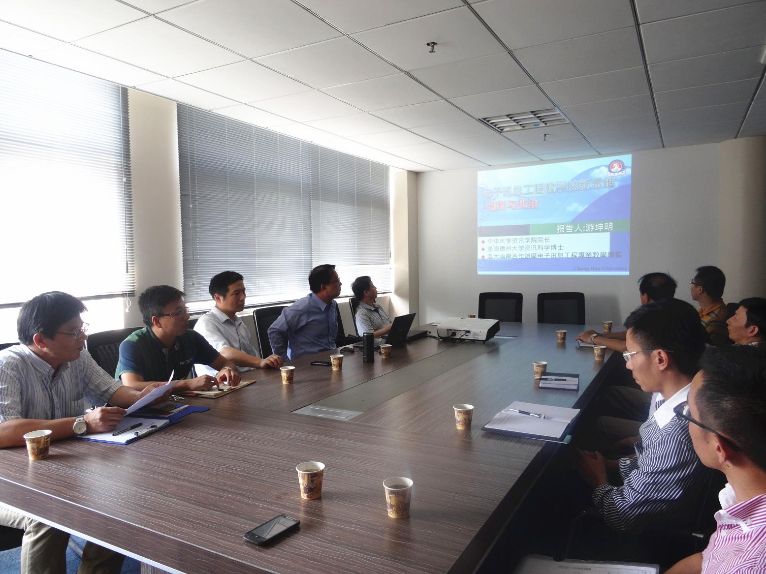 游坤明教授首先扼要介绍了台湾中华大学的办学情况;资讯学院的学科建设与专业设置、师资配置、科研成果、产学合作和跨领域合作等情况并重点介绍了物联网实验室以及实验室的使用情况。他强调参访、实做与实践是教学不可或缺的三大环节,促进研究与教学相结合以便达到教学生活化、实际化与产权化。他建议任课老师在教学中应该使用英文教学专业术语,做到与国际化教材的无缝接轨。同时,他希望在该项目的专业规划中做到三点:即在教学与人才培养中做到与国际接轨;注重学生实践能力的培养;培养学生的电子信息产业观。