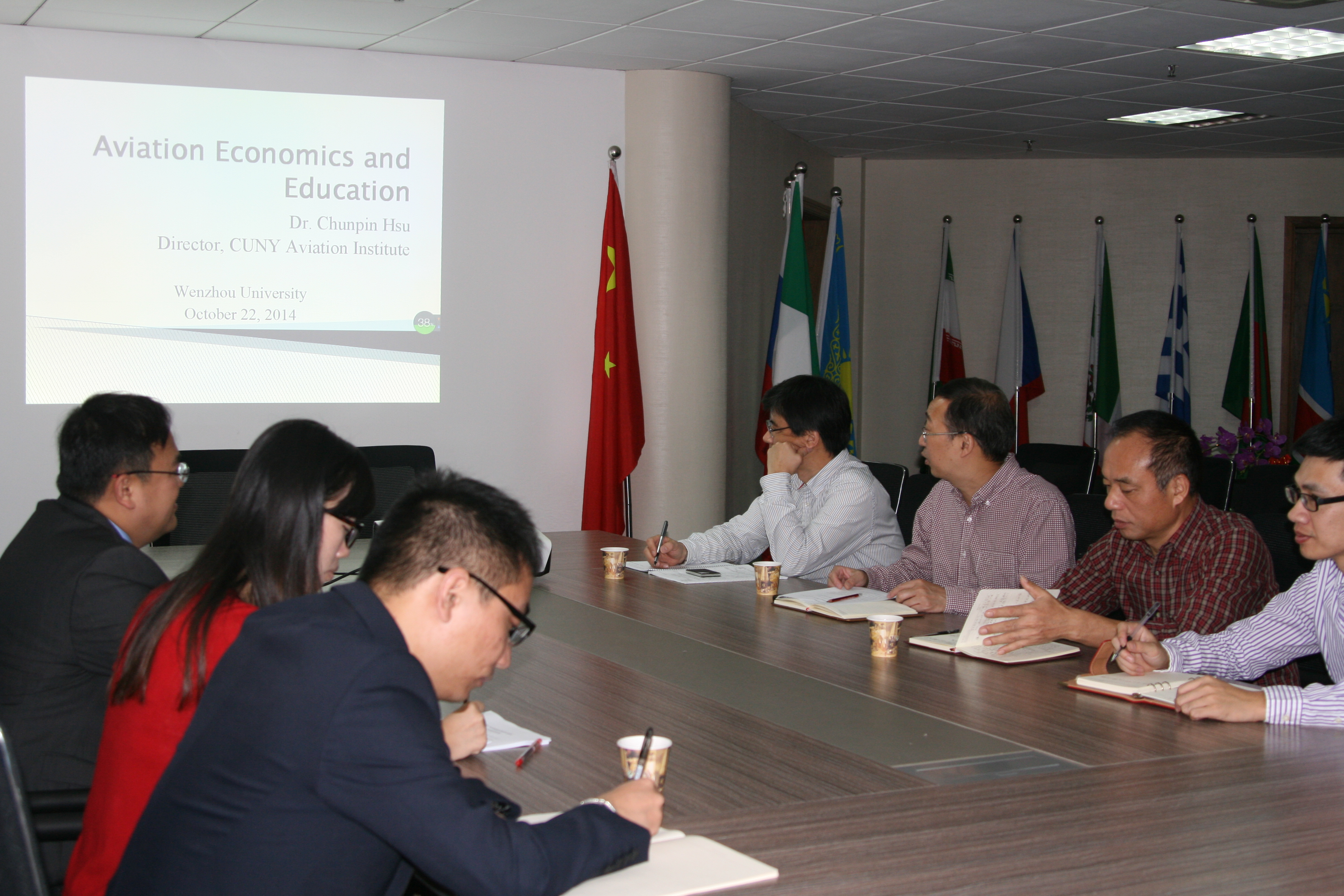 2014年10月22日上午,美国纽约城市大学约克学院(York College, The City University of New York)航空中心主任许竣斌博士莅临太阳官网,举行了题为“航空经济与高等教育”的讲座。讲座由国际合作学院院长严晓鹏博士主持,学院党委书记朱建平、副院长陈军及学院、华文教育研究所教师参加。