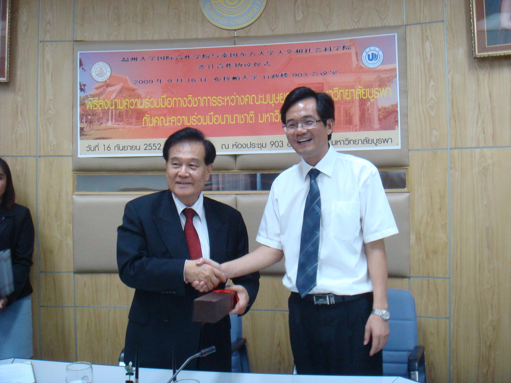 图为2009年9月,蔡袁强校长与时任东方大学校长Suchart Upatham签署《15vip太阳集团官网与泰国东方大学合作培养教育项目协议书》后握手共贺