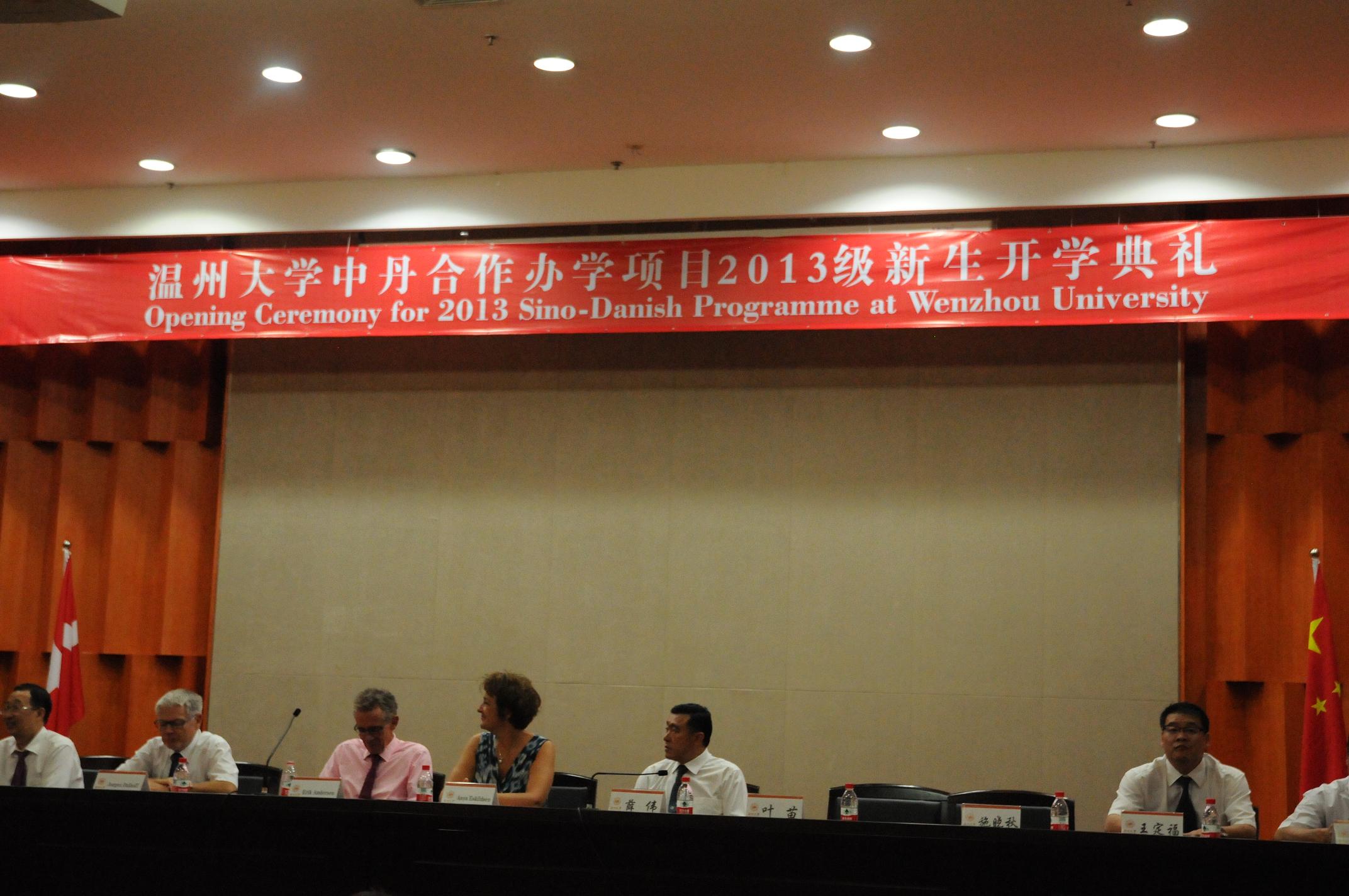 典礼在中丹两国国歌声中拉开序幕。薛伟副校长和Anya校长分别致辞。薛校长向出席典礼的来宾和同学表示热烈的欢迎,他指出,合作办学两年来,中丹项目的教学与管理团队积极借鉴国外先进的办学经验,整合优质教育资源,探索中欧两地专业实习、师生海外交流等人才培养模式,使中丹项目社会美誉度不断提高,合作办学的独特魅力越来越被社会所青睐。他希望2013级新生珍惜大好青春年华,不辜负父母和老师的殷切期望,走正道、无旁骛、不懈怠,做一个持之以恒的求知者,学以立德,学以增智,学以创业,努力把自己打造成视野开阔、通晓国际商务规则的高端复合型国际化人才。Anya校长用中文亲切地与新生问好,她充分肯定了合作办学项目两年来取得的成果,并向同学讲述了中丹合作办学的前景,希望同学们坚持自己的理想,向预定的目标努力前进。