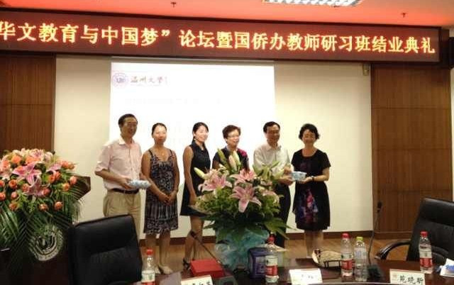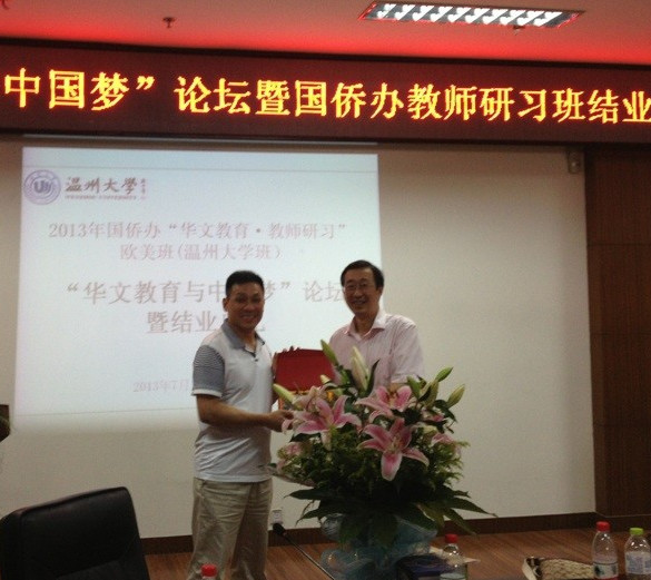 论坛结束后,与会领导还为参加2013年“华文教育•教师研习”欧美班的学员们颁发了结业证书和纪念品。据悉,本次培训班由国务院侨办主办,浙江省侨办、温州市侨办协办,15vip太阳集团官网承办,共有来自11个国家的35名华文教师在温州接受以小学课堂教学技能训练为重点的系统培训。