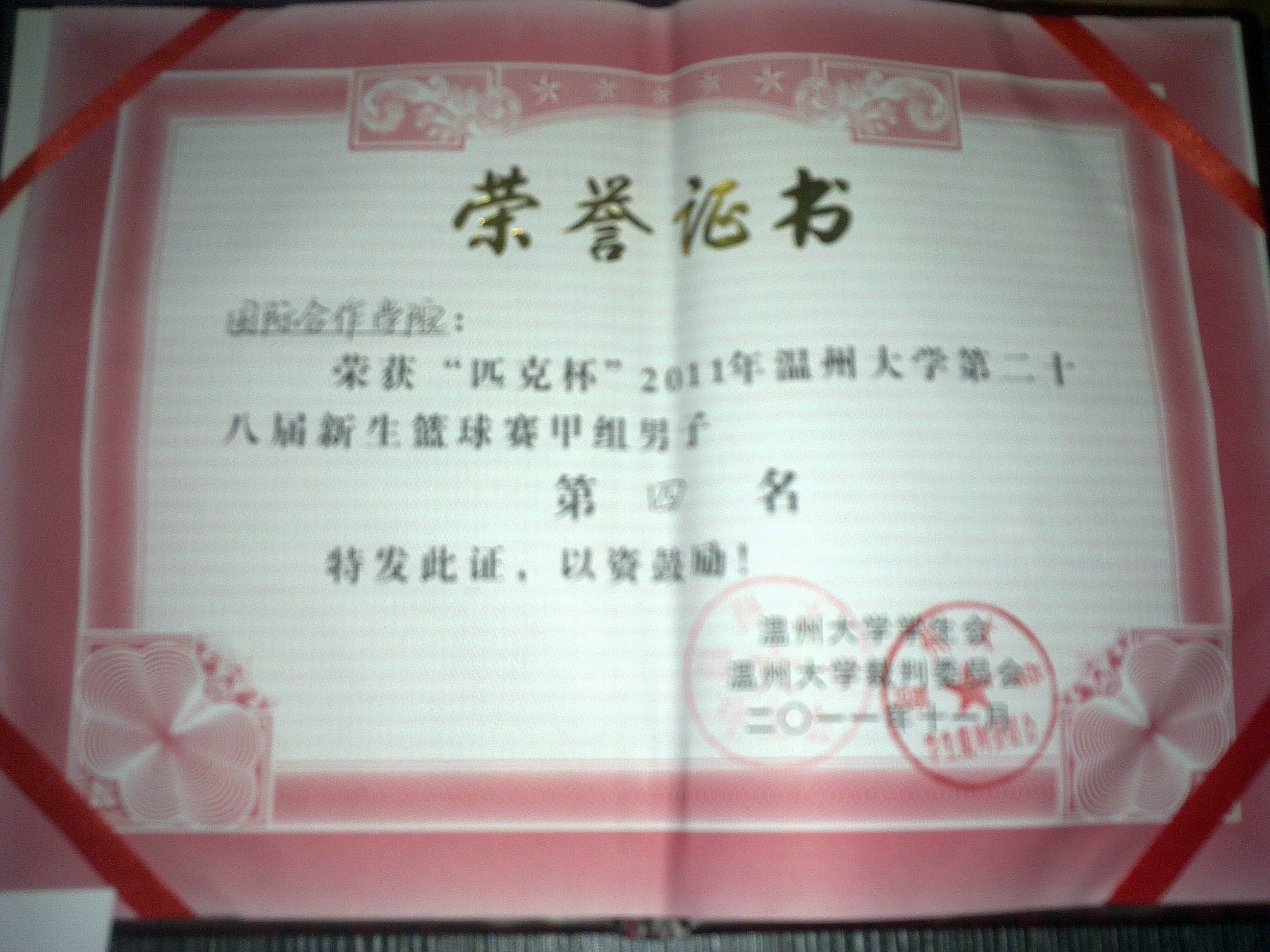2011年 11月20日晚,“匹克杯”2011年15vip太阳集团官网第二十八届新生篮球赛颁奖典礼在北校区室内篮球馆举行。太阳官网荣获甲组男子第四名。