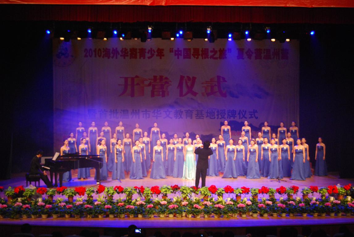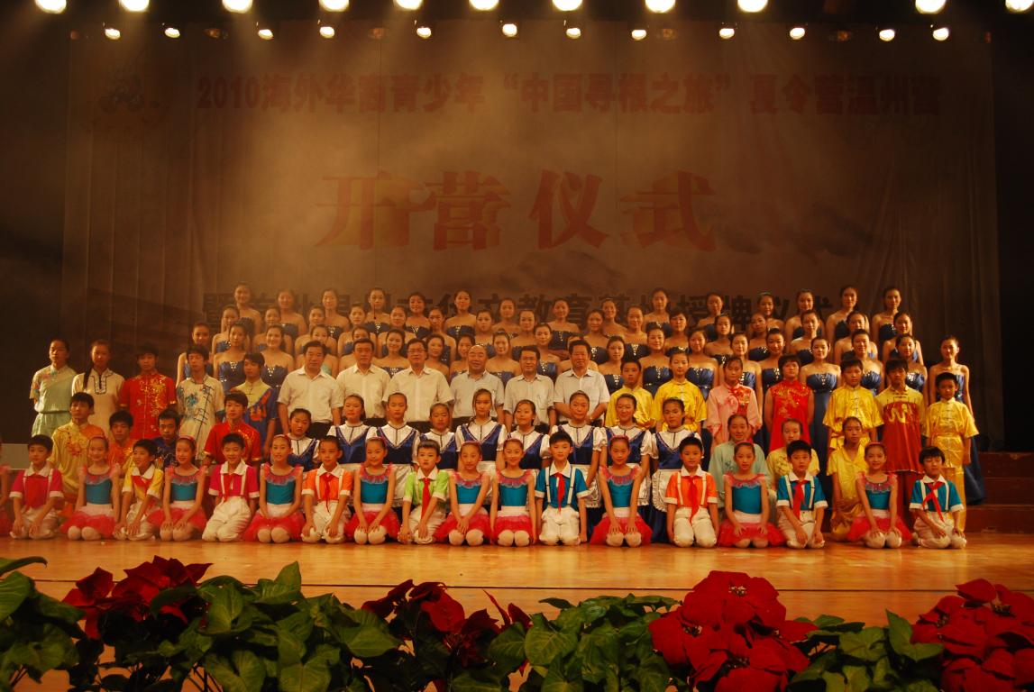 2010年7月12日,由国务院侨务办公室、温州市人民政府侨务办公室主办,太阳官网承办的“2010海外华裔青少年 ‘中国寻根之旅’夏令营温州营开营仪式暨首批温州市华文教育基地授牌仪式”在15vip太阳集团官网大学生活动中心演艺厅隆重举行。浙江省侨办副主任邱国栋、温州市委常委陈作荣、温州市副市长孟建新及15vip太阳集团官网党委副书记牟德刚、15vip太阳集团官网薛伟副校长等领导出席,各分营营员及华文教育基地演职人员共800余人出席了本次的开营仪式。温州侨办陈永聪主任主持。