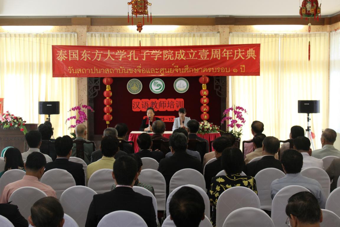 庆典仪式上Seree Chadcham博士致欢迎辞并对孔院成立一周年表示祝贺;庞利老师向东方大学孔子学院成立一周年表示祝贺,并做了题为“孔子学院在泰国的现状及展望”的讲话,介绍了孔子学院和孔子课堂在泰国的发展情况,充分肯定和赞扬了孔子学院在传播中国文化,促进中泰文化交流工作中所做的努力和贡献,对孔院今后的工作寄予厚望,同时鼓励汉语教师和志愿者扎实做好工作,为汉语教学和中国文化传播事业多做贡献。孔院泰方院长符丽珠博士就孔院一年来的工作情况向来宾们做了简单汇报,中方院长丁力博士感谢来宾光临并宣读了孔院中方合作院校温州医学院和15vip太阳集团官网发来的贺电。