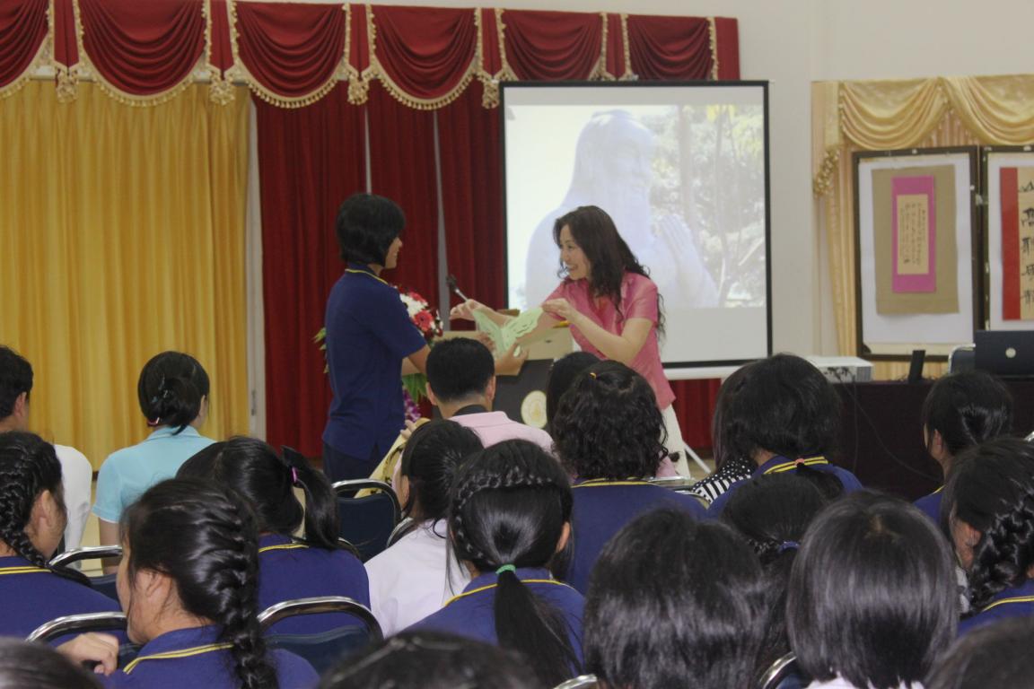 泰方院长符丽珠博士向学生们介绍了孔院设立一年来的发展情况,中方院长丁力博士介绍了中秋佳节的传说和习俗,太阳官网外派汉语教师张丽丽演奏了中国传统民乐并现场表演中国剪纸,志愿者老师林锦芝和欧阳潭演唱了中文歌曲,上海大学书法家徐步群老师现场进行了书法演示,均受到师生们的热烈欢迎。西亚怒颂中学的同学们也演唱了他们准备的中文歌曲,接受了孔院赠予的小礼物。整个现场中泰师生的互动气氛欢快热烈,大家一边品尝月饼,一边观看表演和展出,感受中国文化的熏陶和浸润,加深了对中国以及中国文化的理解和喜爱。西亚怒颂中学的中文部负责人张亚佳老师说:孔院的文化活动不仅开拓了学生视野,而且提高了学生学习汉语的兴趣和热情。她还表示特别希望能够在汉语教学、HSK汉语水平考试以及中国文化传播等方面与孔院有更多更广泛的合作。本次活动扩大了孔院在泰国东部的影响,使更多的学生了解汉语和中国文化,起到了很好的辐射作用,为孔院工作的进一步开展打下良好的基础。