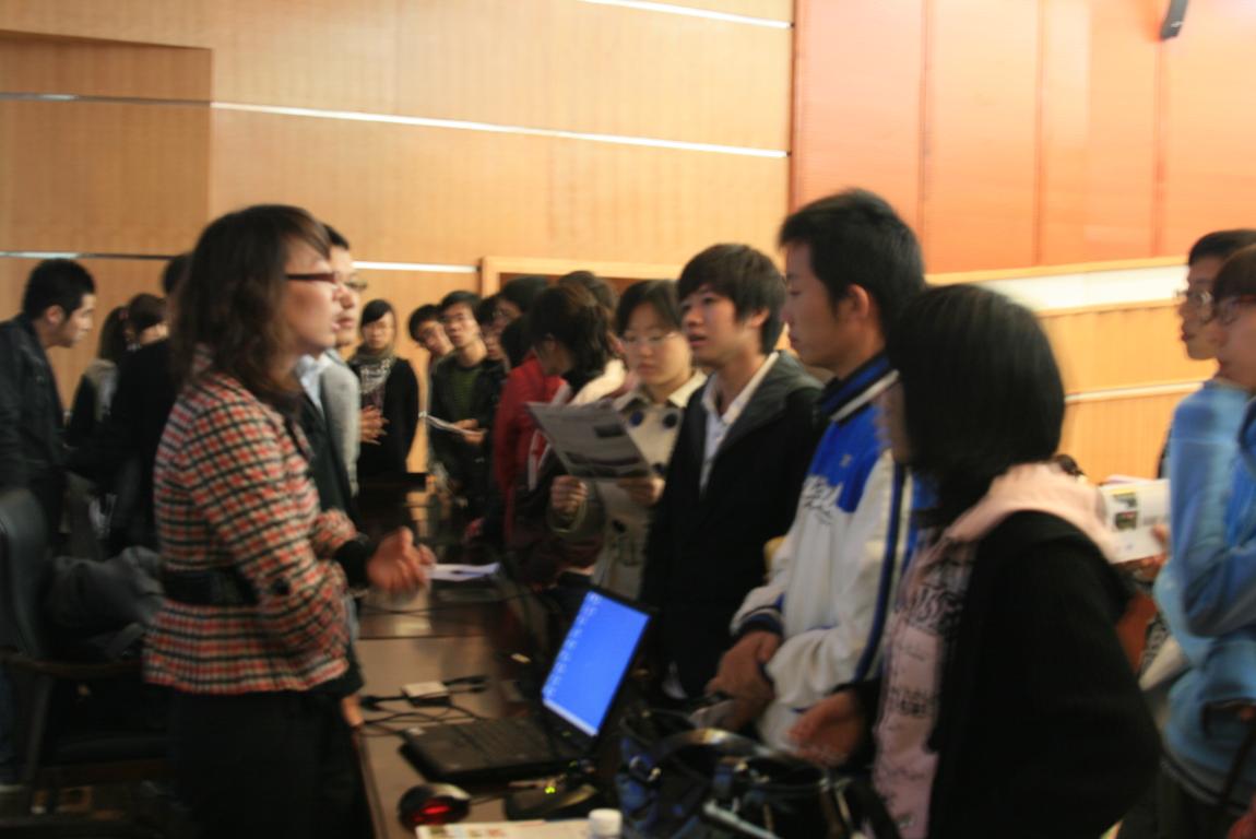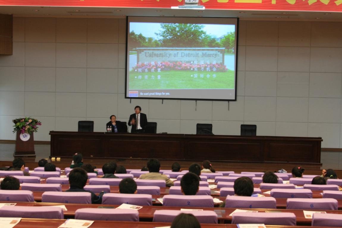 2009年11月16日下午在茶山高教园区15vip太阳集团官网图书馆二楼报告厅举行了别开生面的留学美国说明会。院长严晓鹏,党委书记方建敏,副院长陈军,对外项目办主任包含丽,美国底特律大学招生主管Louis Lin博士等出席了说明会。说明会由院长严晓鹏主持 。130多名来自15vip太阳集团官网各学院的同学参加了说明会。此次说明会重点向温大在校生推荐优质美国留学资源,为温大学子搭建低成本高效便捷的就读美国本硕课程的平台。