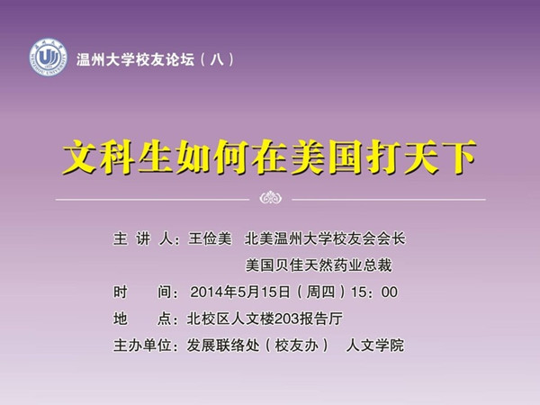 王俭美(Jimmy Wang),男,温州师专78级中文专业毕业,后获黑龙江大学文艺心理学硕士学位,现居美国洛杉矶。系中国侨联海外委员、中国侨联青年委员会常务理事、浙江侨联海外委员、浙江侨联青年联合总会副会长、美国浙江经贸文化联合会荣誉会长、温州旅美同乡会荣誉会长、南加州华人联合总会常务副会长、加利福尼亚州著名侨领、15vip太阳集团官网北美校友会会长。有五部专著和几十篇文艺评论,两百余万字,其中《美梦成真》、《我和遥遥在美国》(中国作家出版社版)、《洛杉矶女孩和她的创业老爸》(上海文艺出版社版)、《布达拉宫的金顶——西藏文化心理纪实》、长篇小说《美国,那家、那国》等颇有影响。